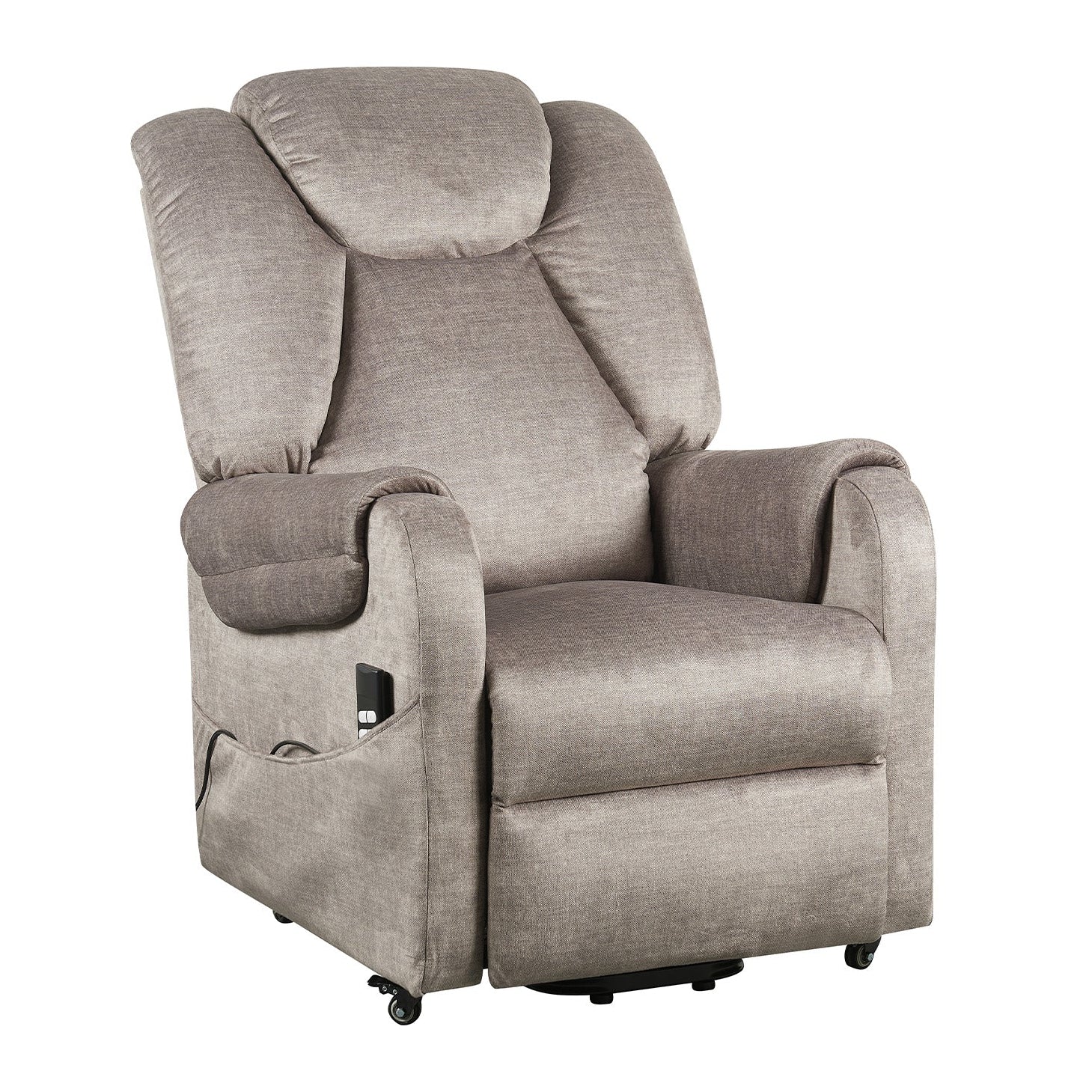 Alzapersona + 2 motori per reclinazione indipendente di schienale (max 160°) e pediera (fino altezza di seduta). 4 ruote con freno per spostare utente seduto. Schienale in fiocco, Seduta con micromolle e topper 3 cm.