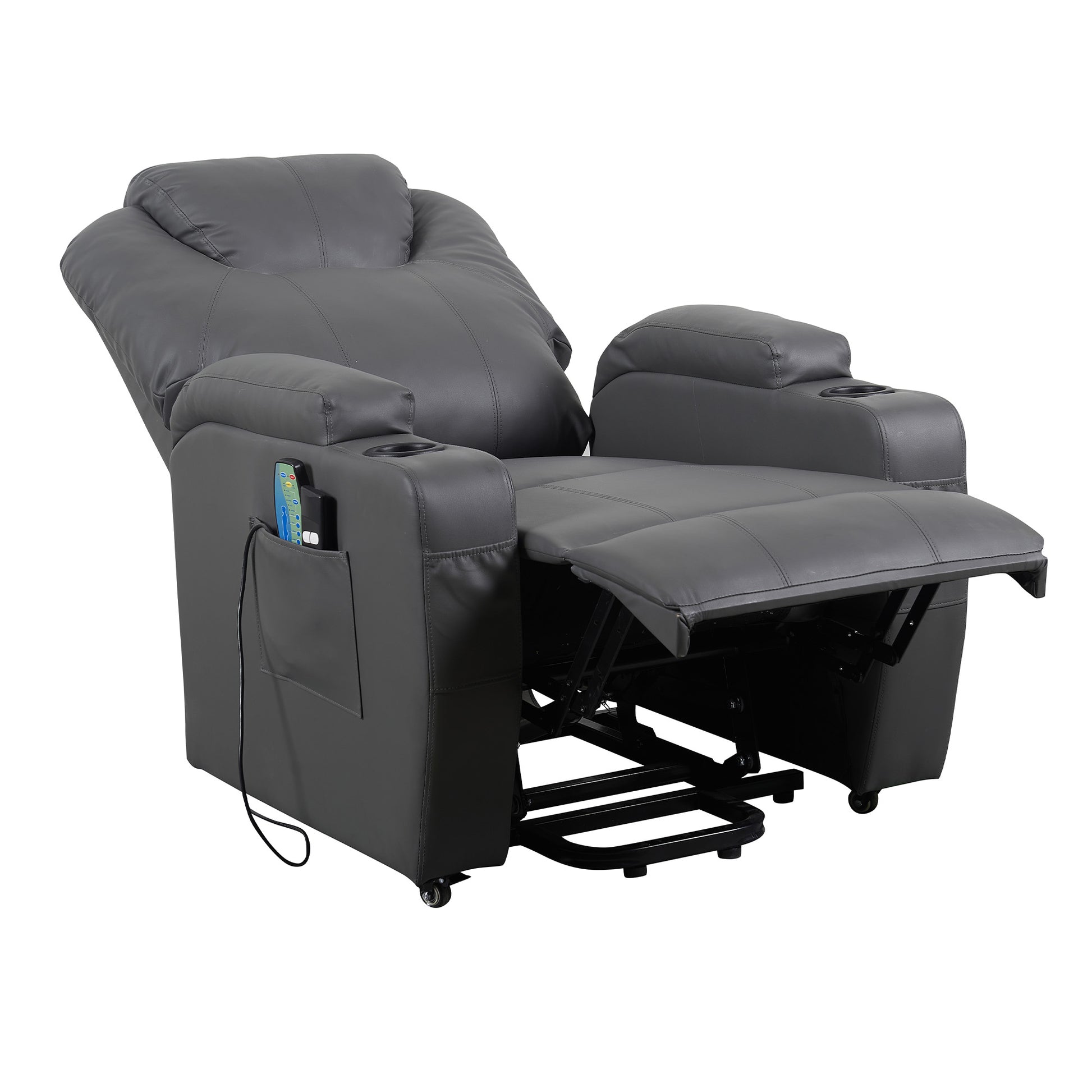 Alzapersona + 2 motori per reclinazione indipendente di schienale (max 160°) e pediera (fino altezza di seduta). 2 Portabicchieri, Vibromassaggio: polpacci, seduta, lombari e spalle. 4 ruote con freno per spostare utente seduto. Schienale in fiocco, Seduta con micromolle e topper 3 cm.