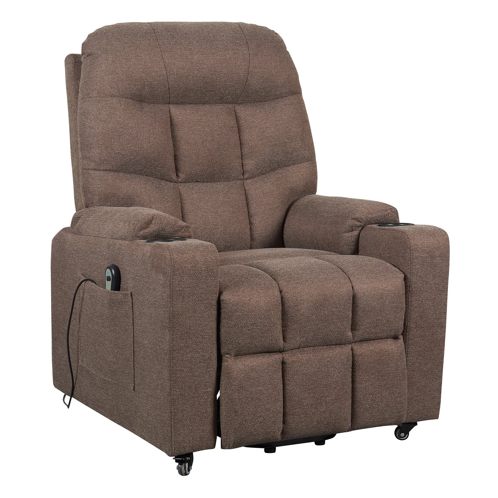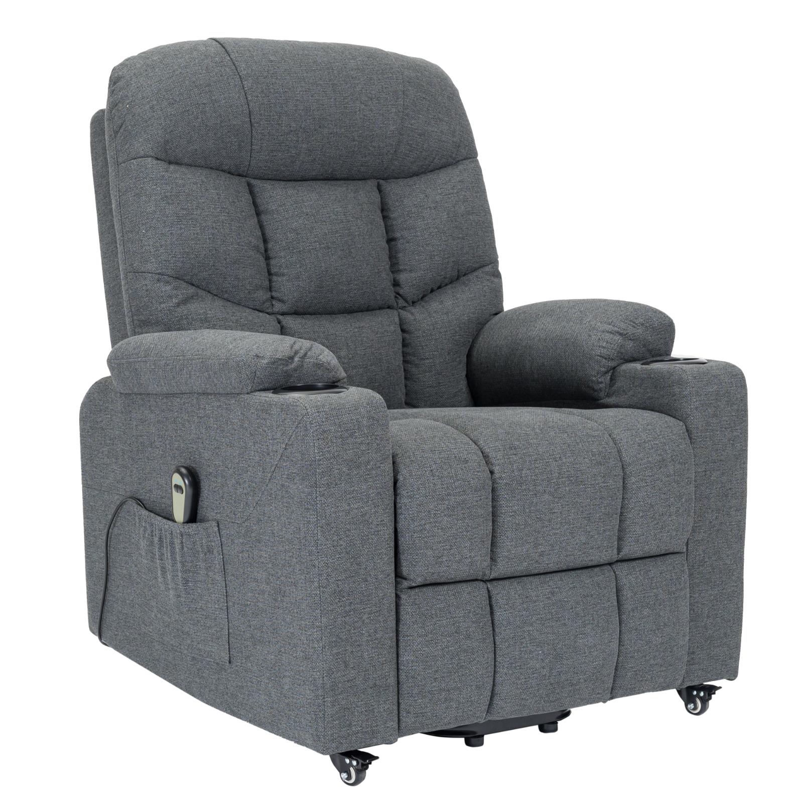 Alzapersona + 1 motore per reclinazione combinata di schienale (max 150°) e pediera. Portabicchieri. 4 ruote con freno per spostare utente seduto. Schienale in fiocco, Seduta con micromolle e topper 3 cm.